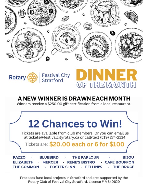 Tickets are available from any Festival City Rotary club member, by email tickets@festivalcityrotary.ca, or call/text (519) 274-2134.
